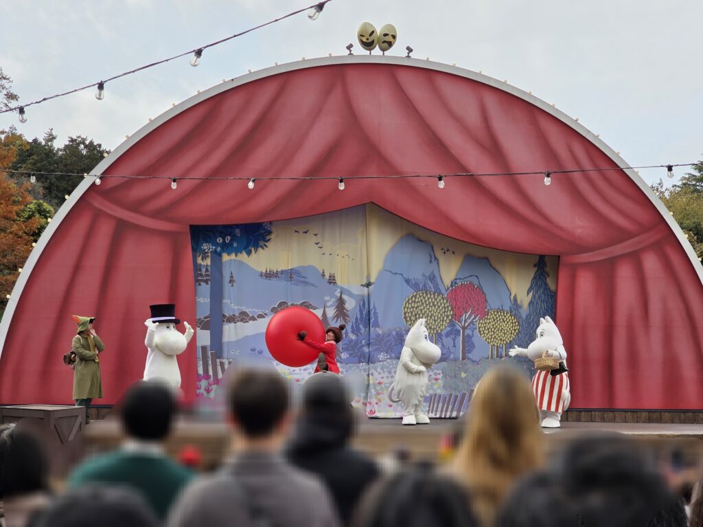 さすがにそこまで待てなかったので、遠くから鑑賞しましたがムーミンやスニークのお嬢さん、ムーミンパパ・ママ、リトルミイ、スナフキン勢揃いの豪華なショーでした!キャラクターが見たい場合は必見です!!