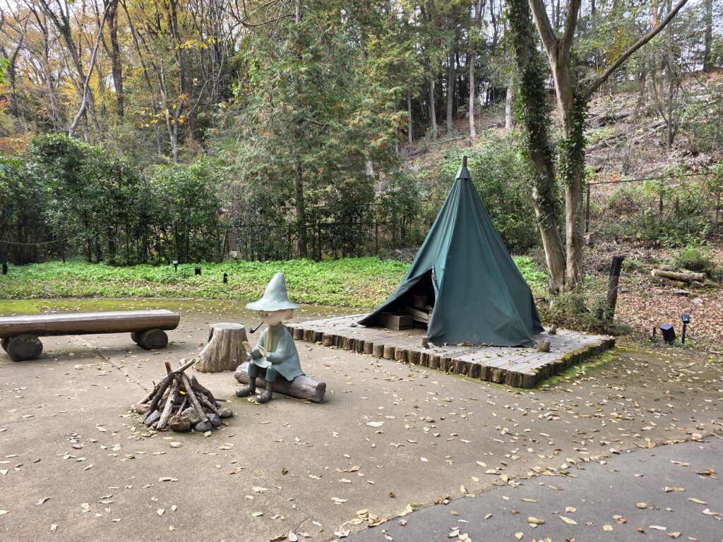 ちなみにスナフキンのテント(写真スポット)やヘムレンさんの遊園地(子供の遊び場)は、ムーミンハウスなどがある中心場所から少し離れた場所にあります。